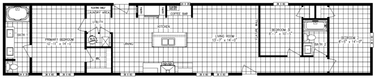 Master Craft Oak 16×68 Available for customer order! 2 Bedrooms, 2 Baths 2×6 – 16” on center exterior walls 40# Roof 200 AMP Architectural Shingles